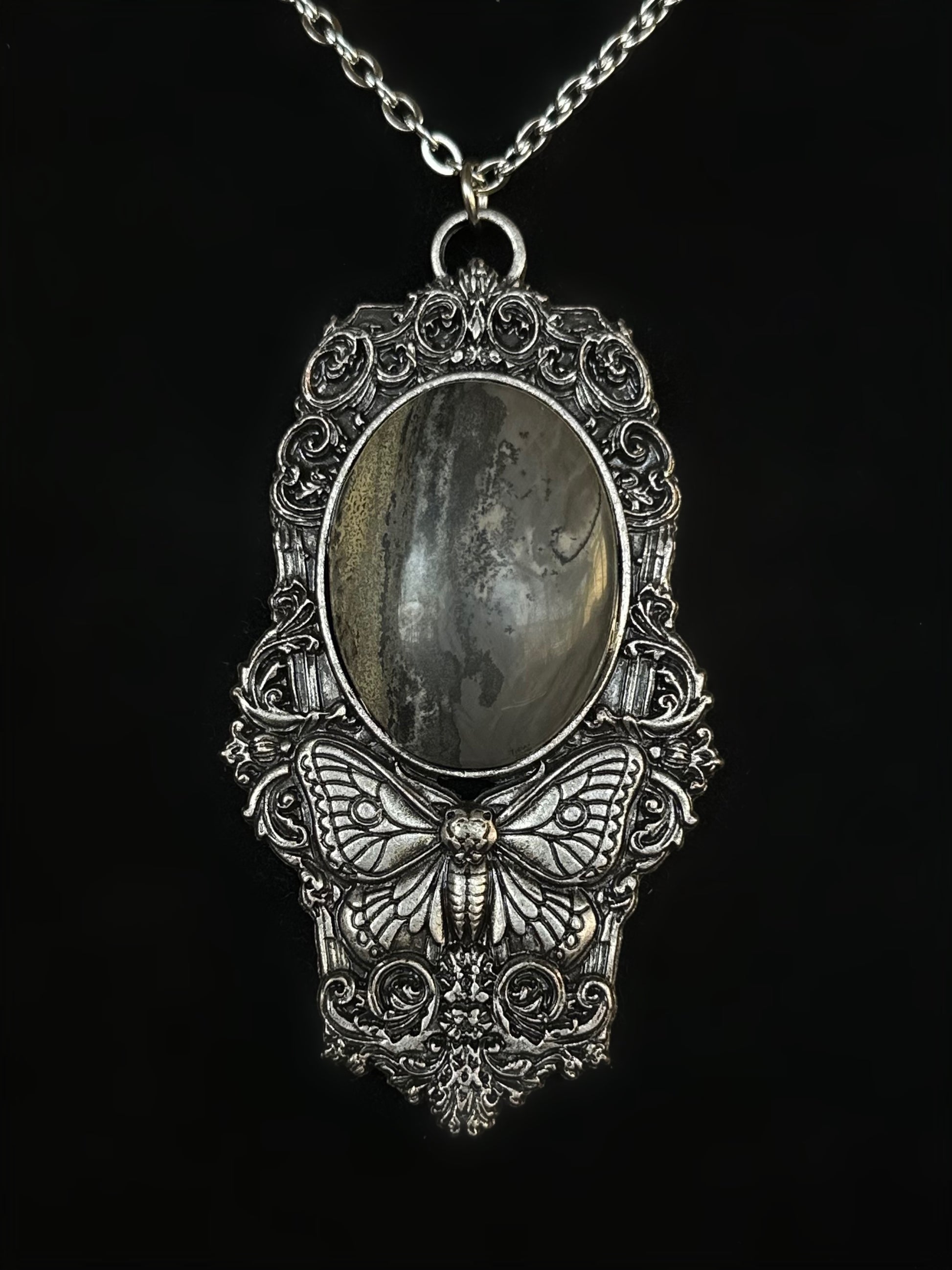 MOTH IN A COFFIN - Mother of Hades Petrified Wood Necklace