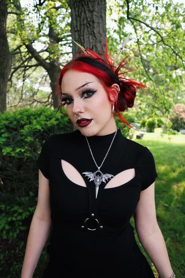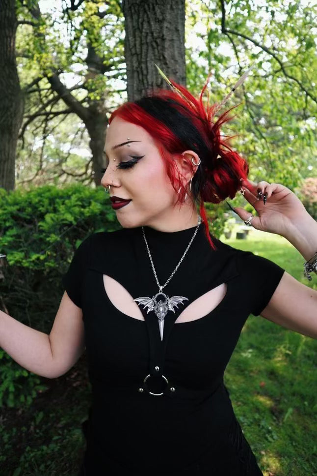 This cast alloy necklace features an ornate brimstone symbol with brutal horns adornments.