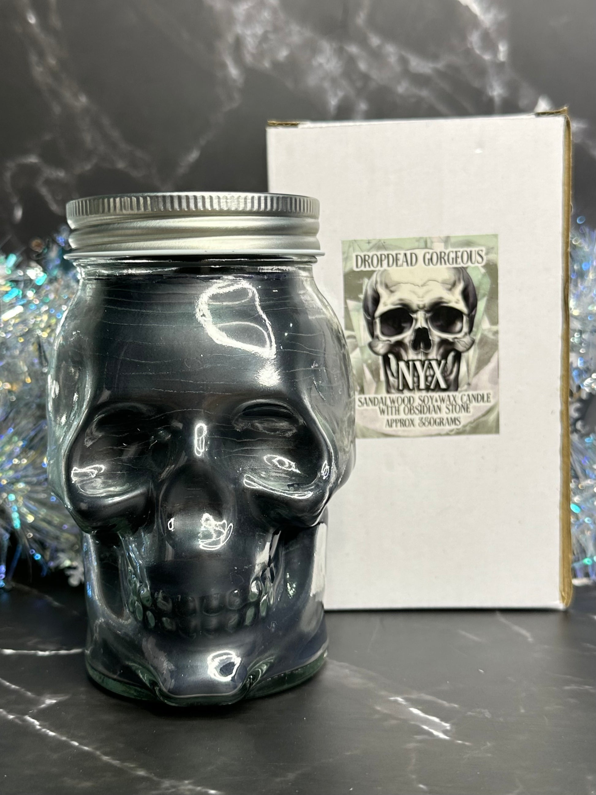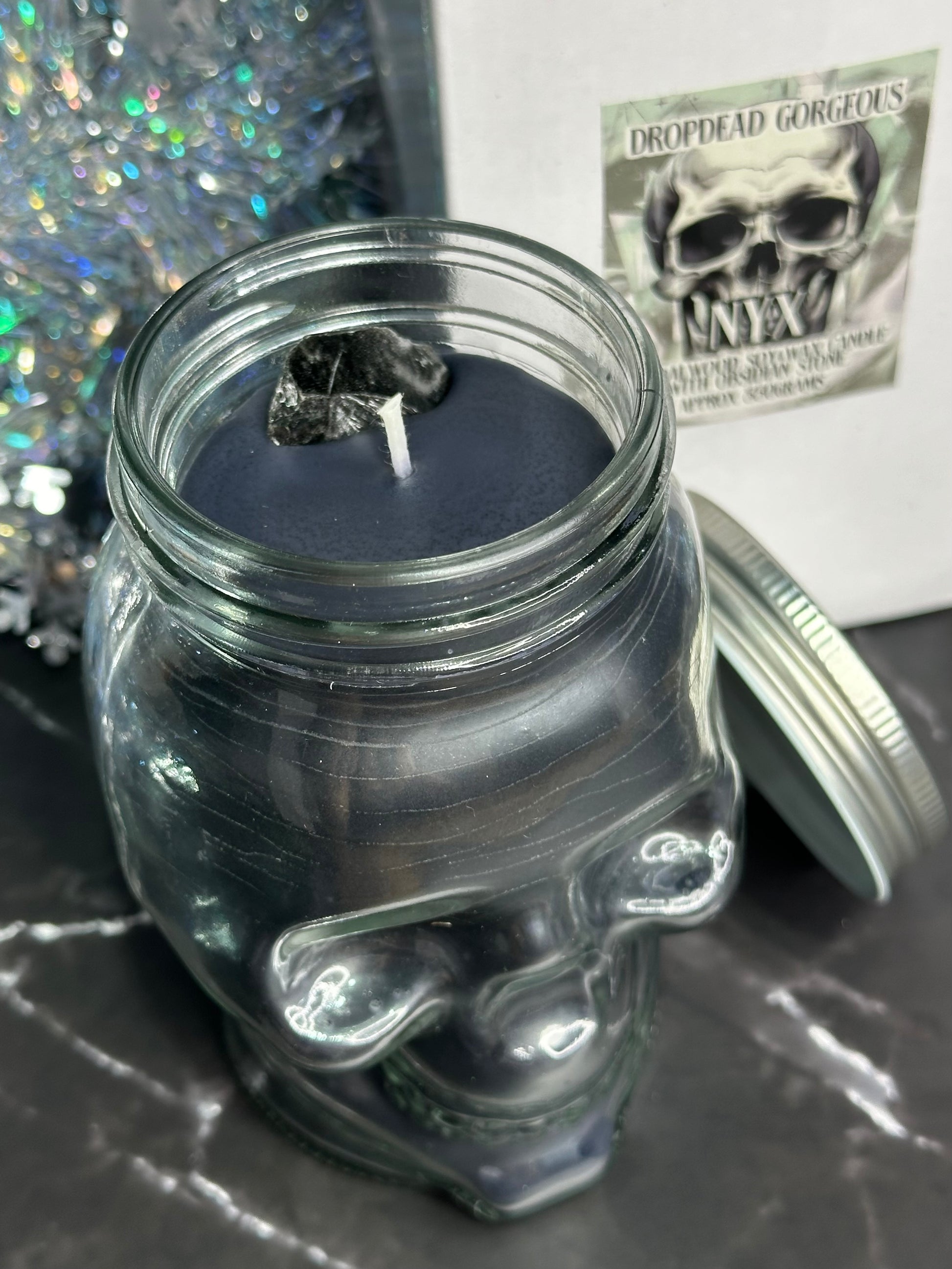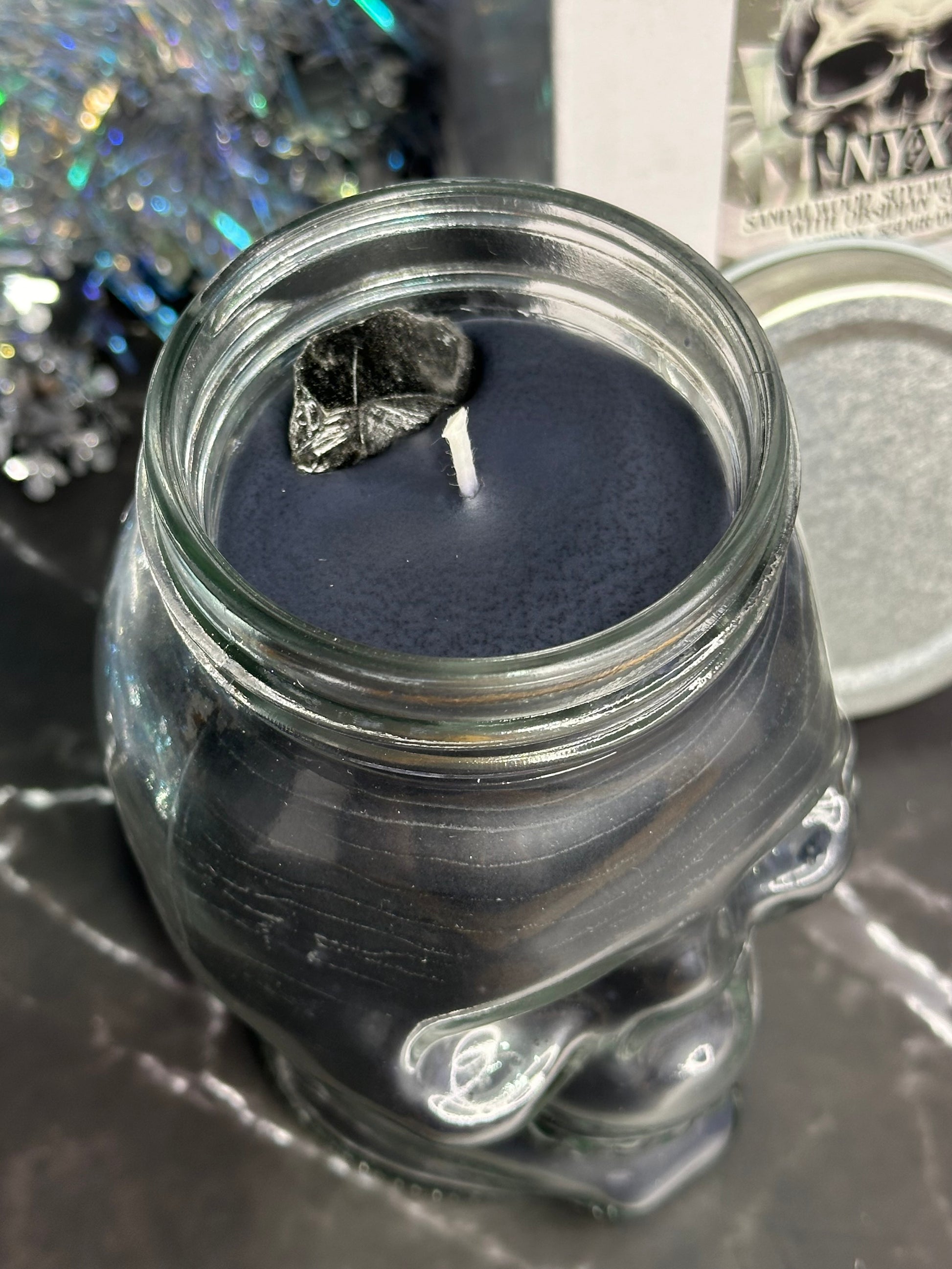 This beautiful hand poured candle is 100% soy wax, topped with a chunk of genuine adventurine in a glass, skull shaped, reusable vessel.