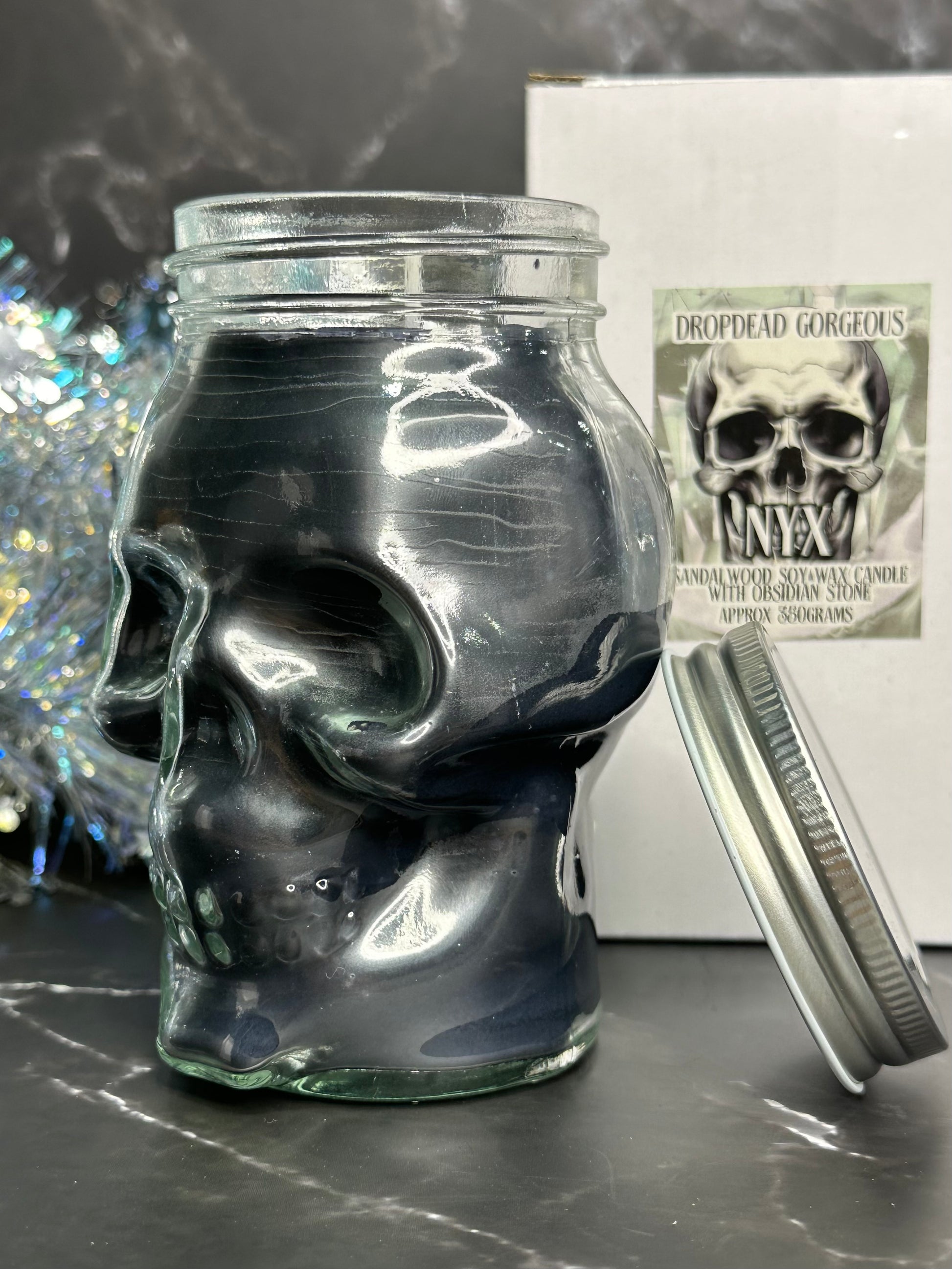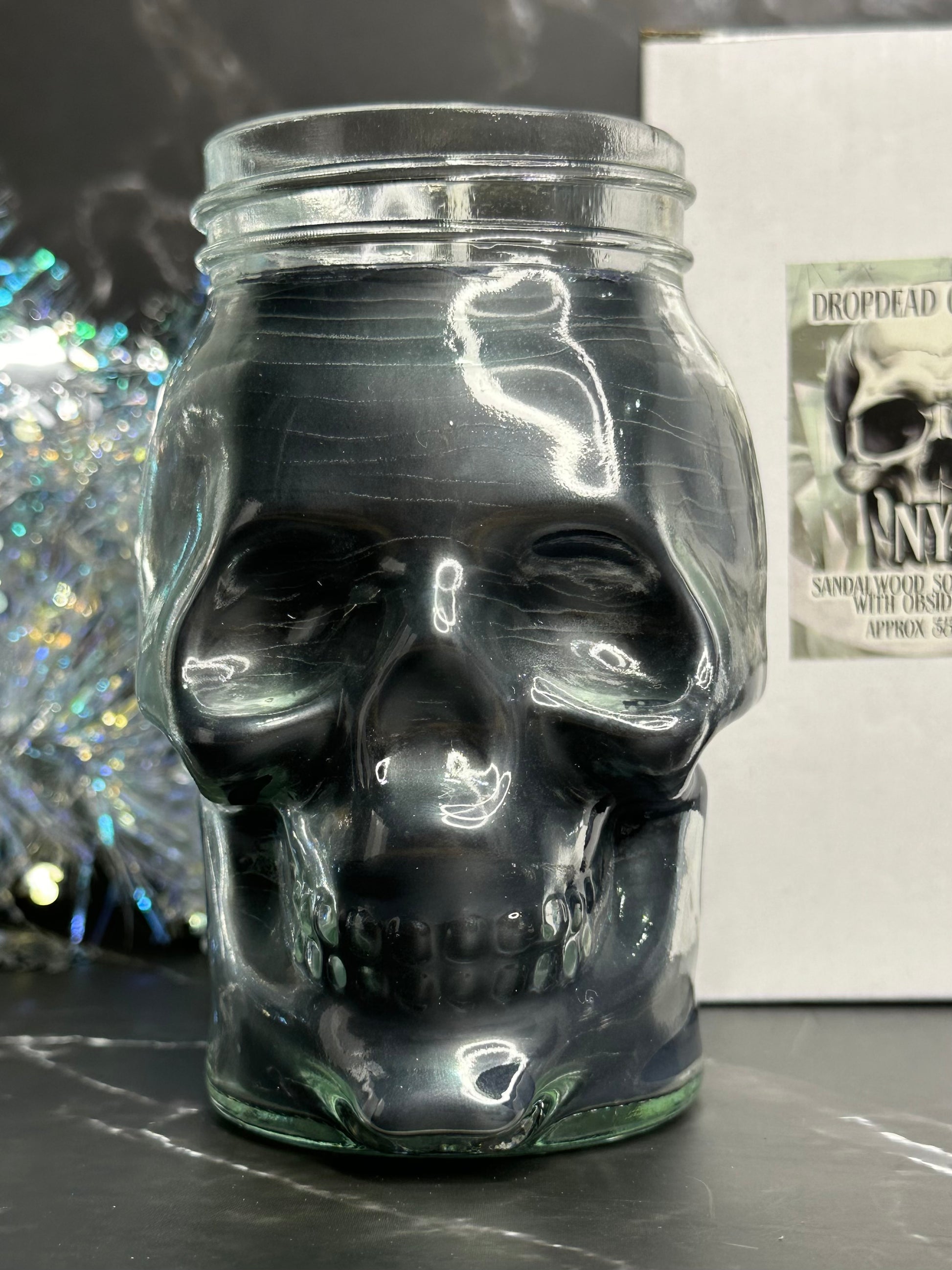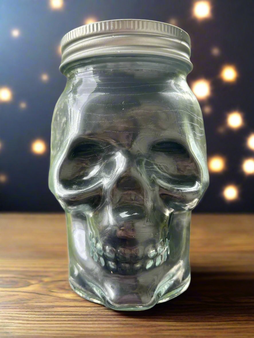 This beautiful hand poured candle is 100% soy wax, topped with a chunk of genuine adventurine in a glass, skull shaped, reusable vessel.