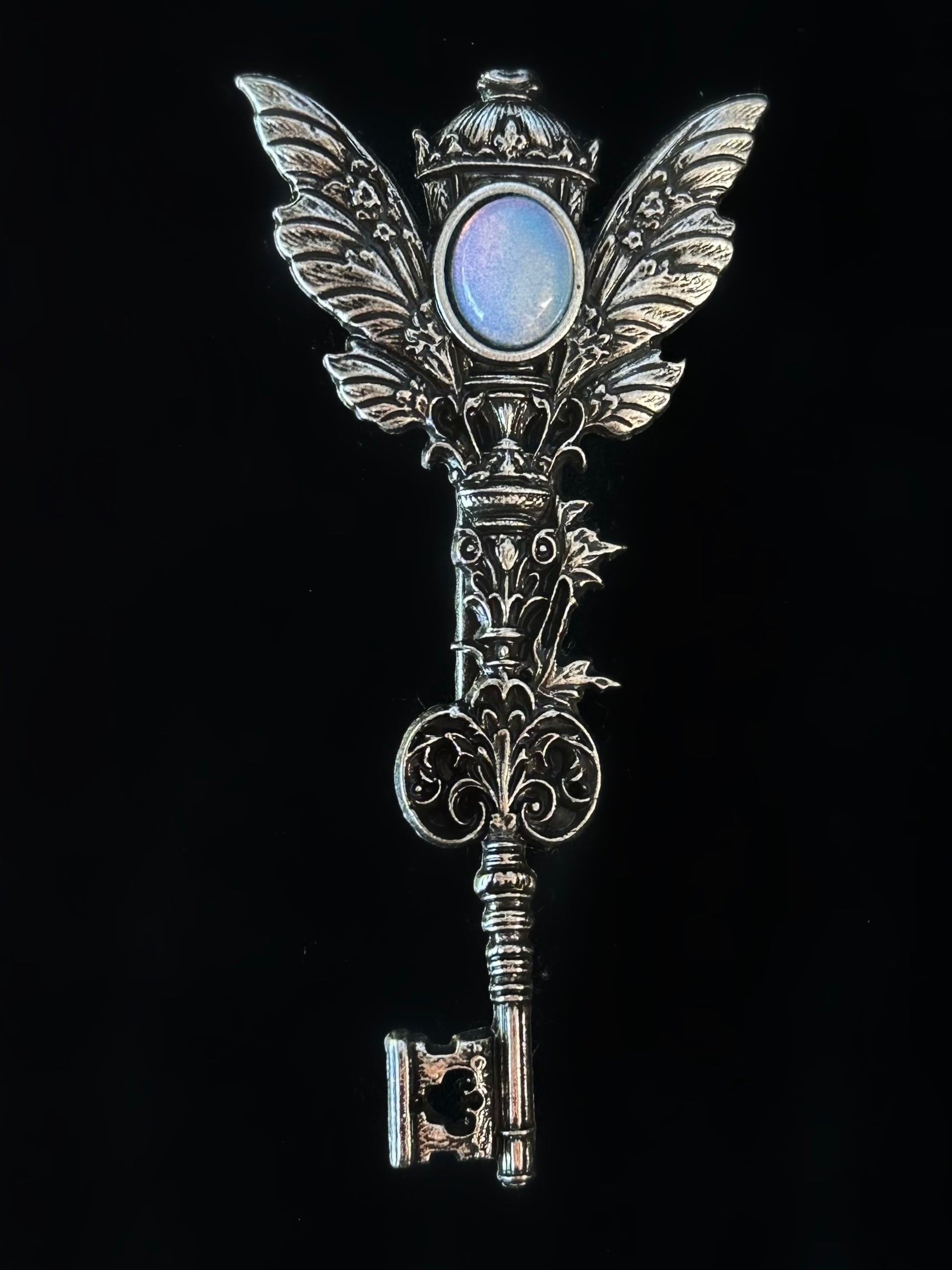 Unlock hidden portals and discover the unknown! Our Magic Key hair clips add a subtle touch of enchantment everywhere they fly. This elaborated winged key has an opalite stone set in place that catches and shifts light.