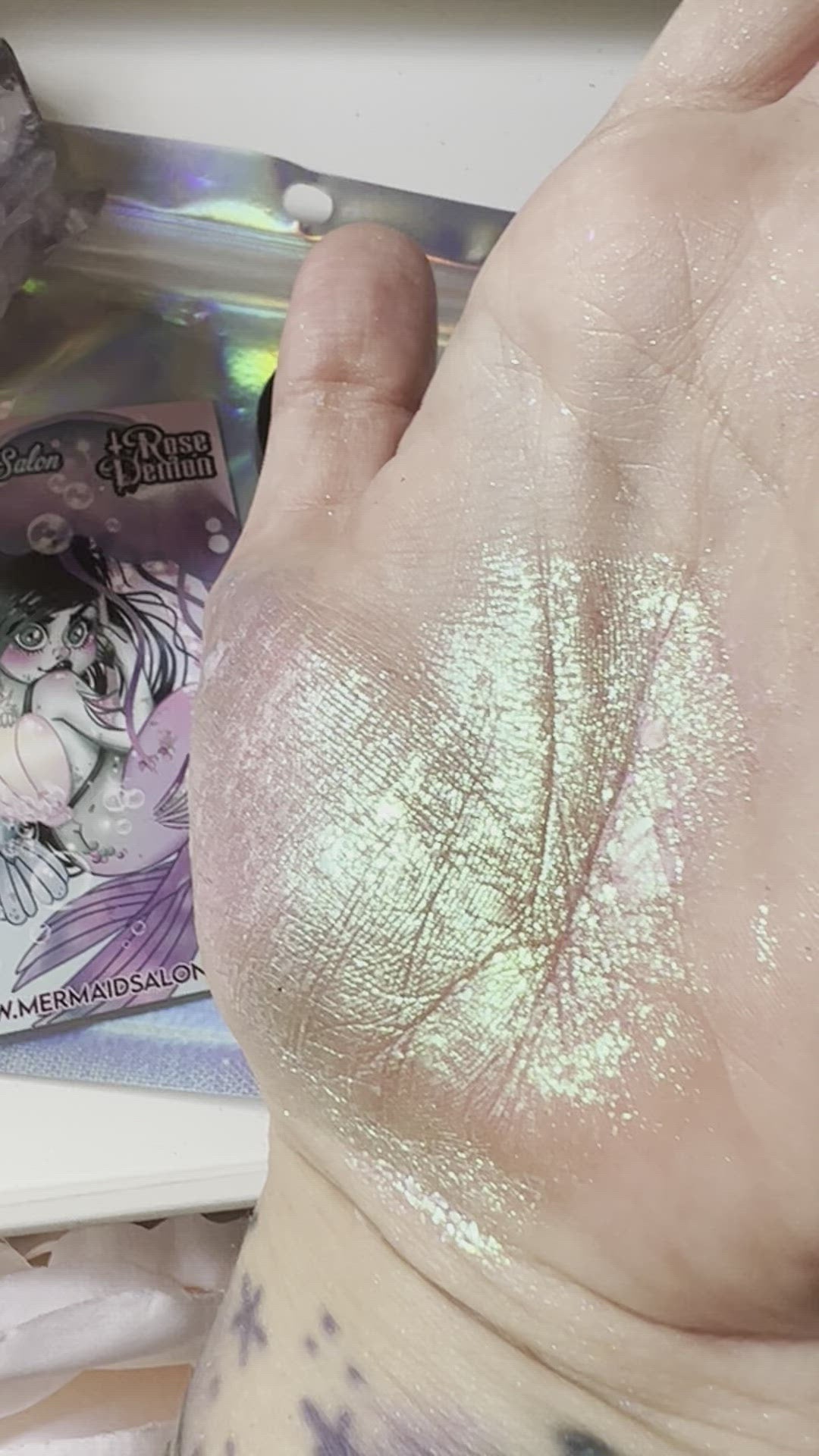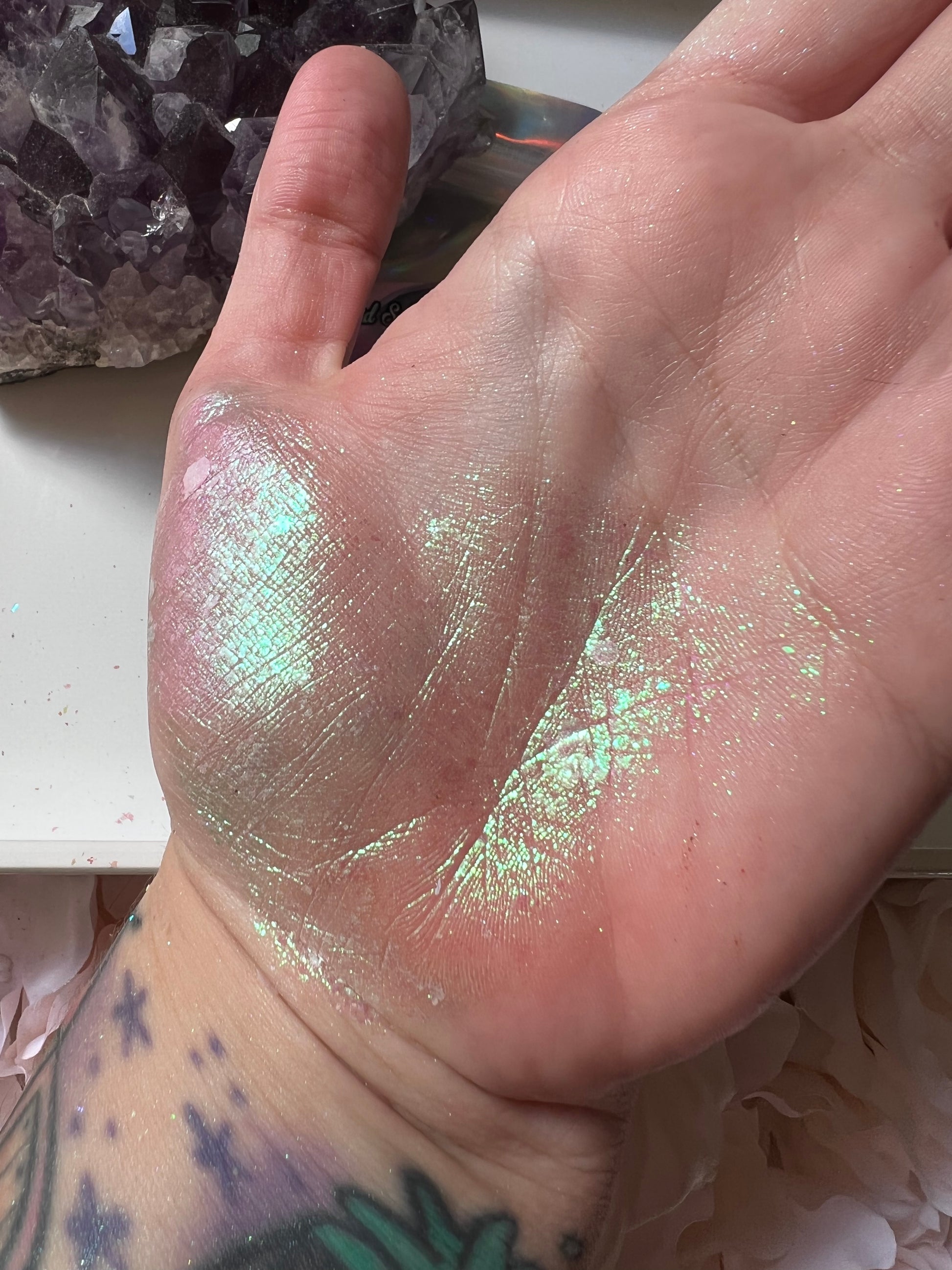 alternatively, apply application gel directly to skin, allow to turn slightly tacky after a few second and pat iridescent flakes over the top.