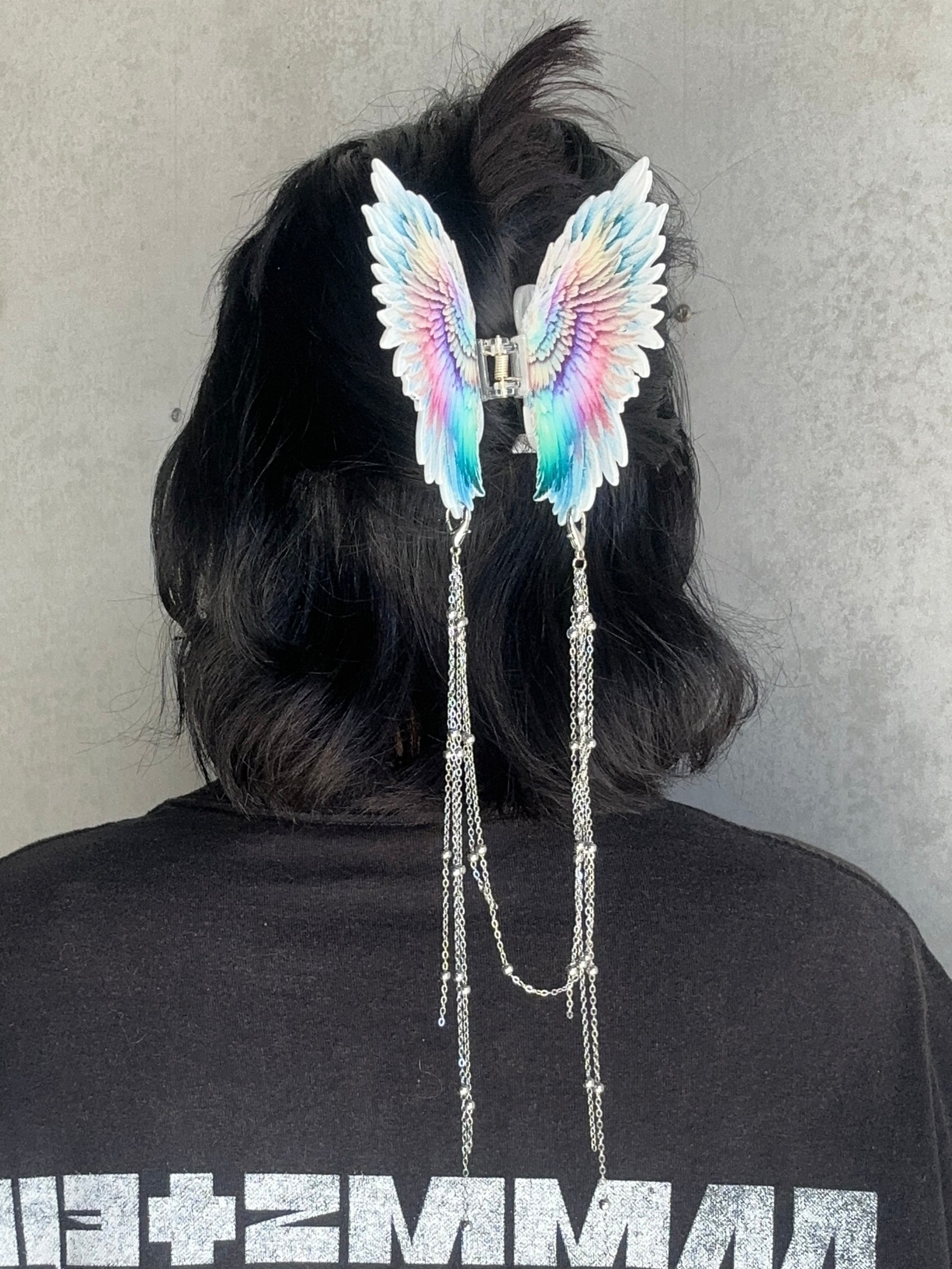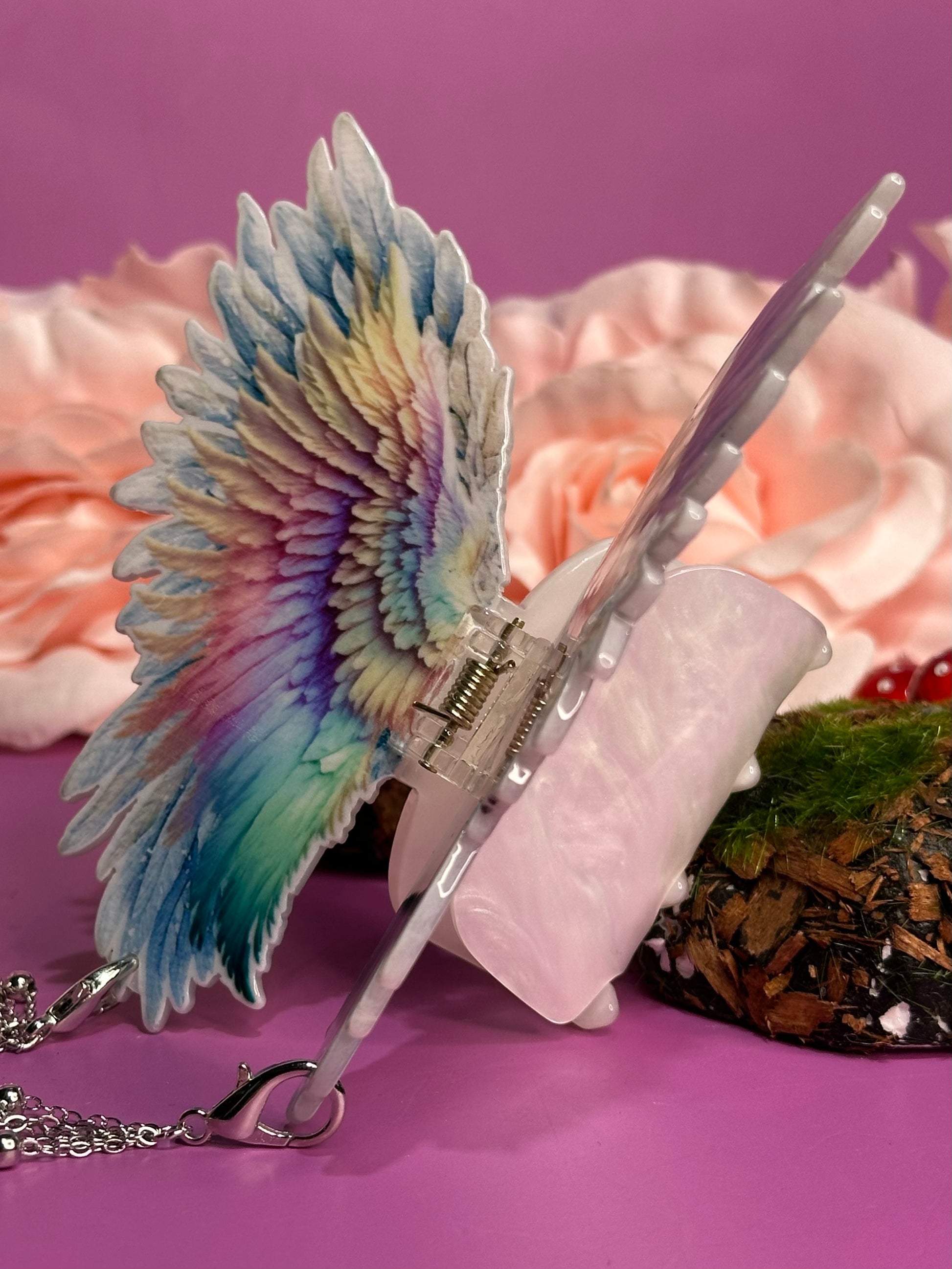 Gorgeous custom made angel wing claw clip with removable rosary chain style attachment. printed acrylic and alloy